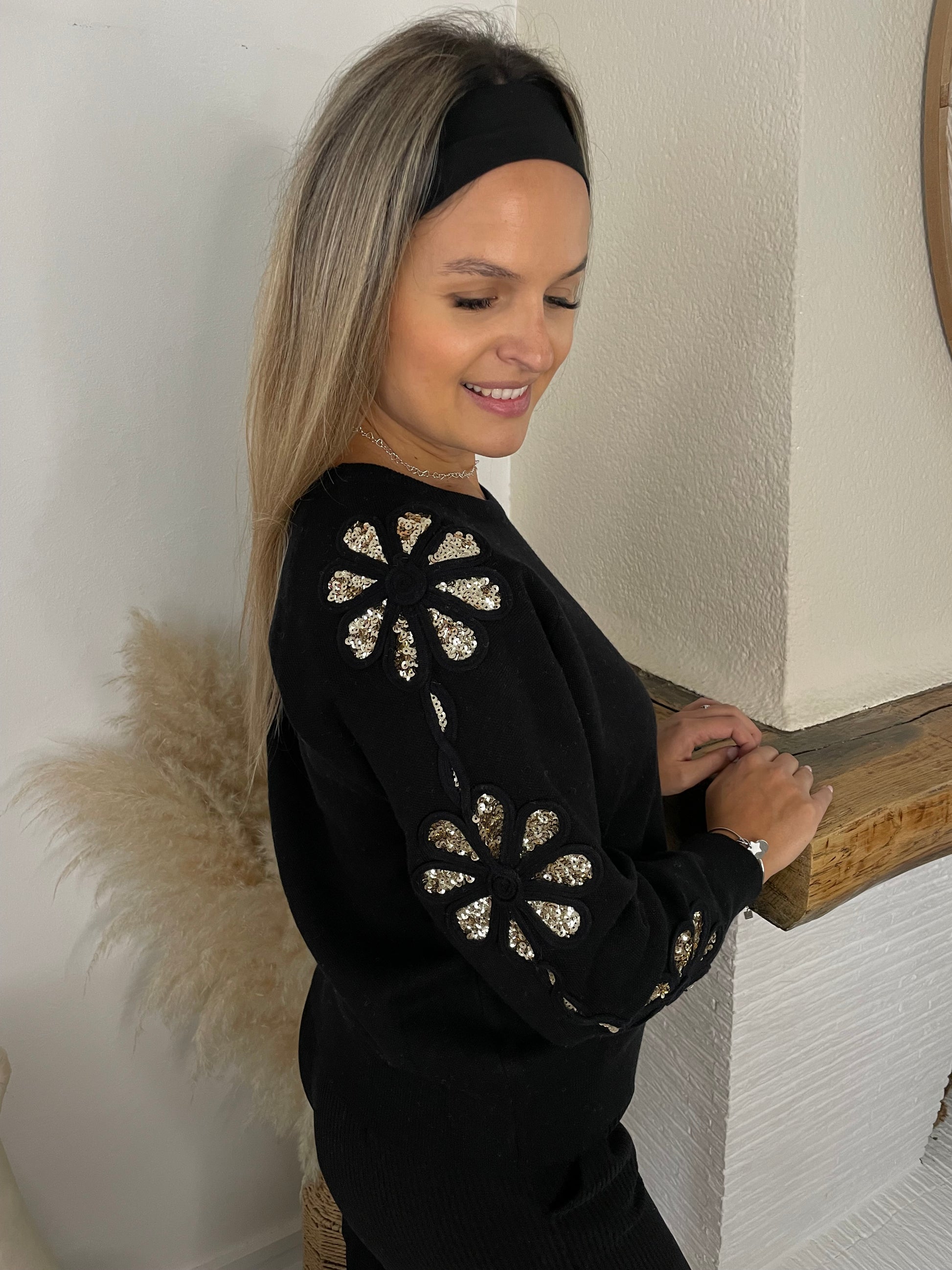 Joli pull blanc avec fantaisies aux manches. Les paillettes sont en sequin.