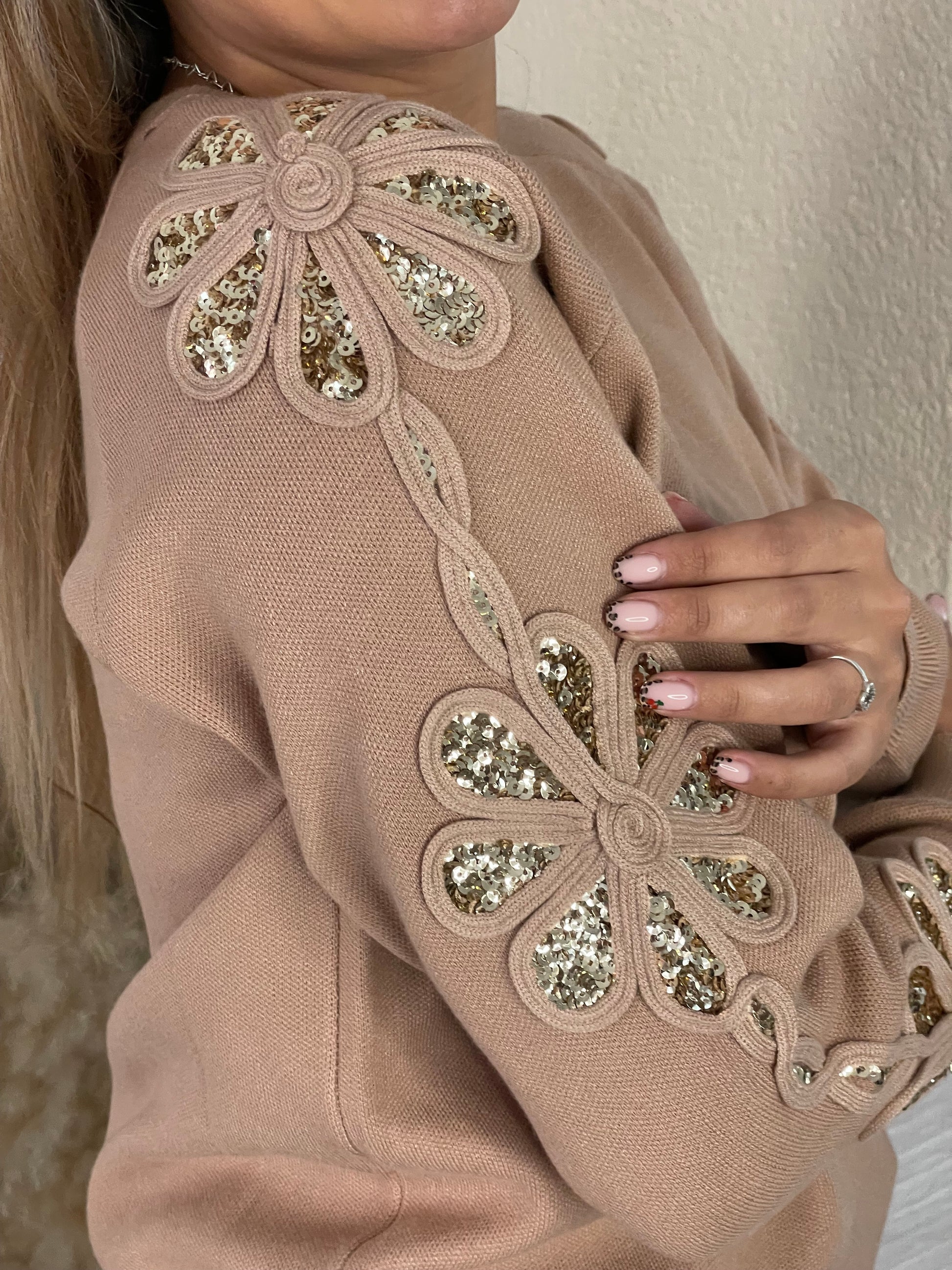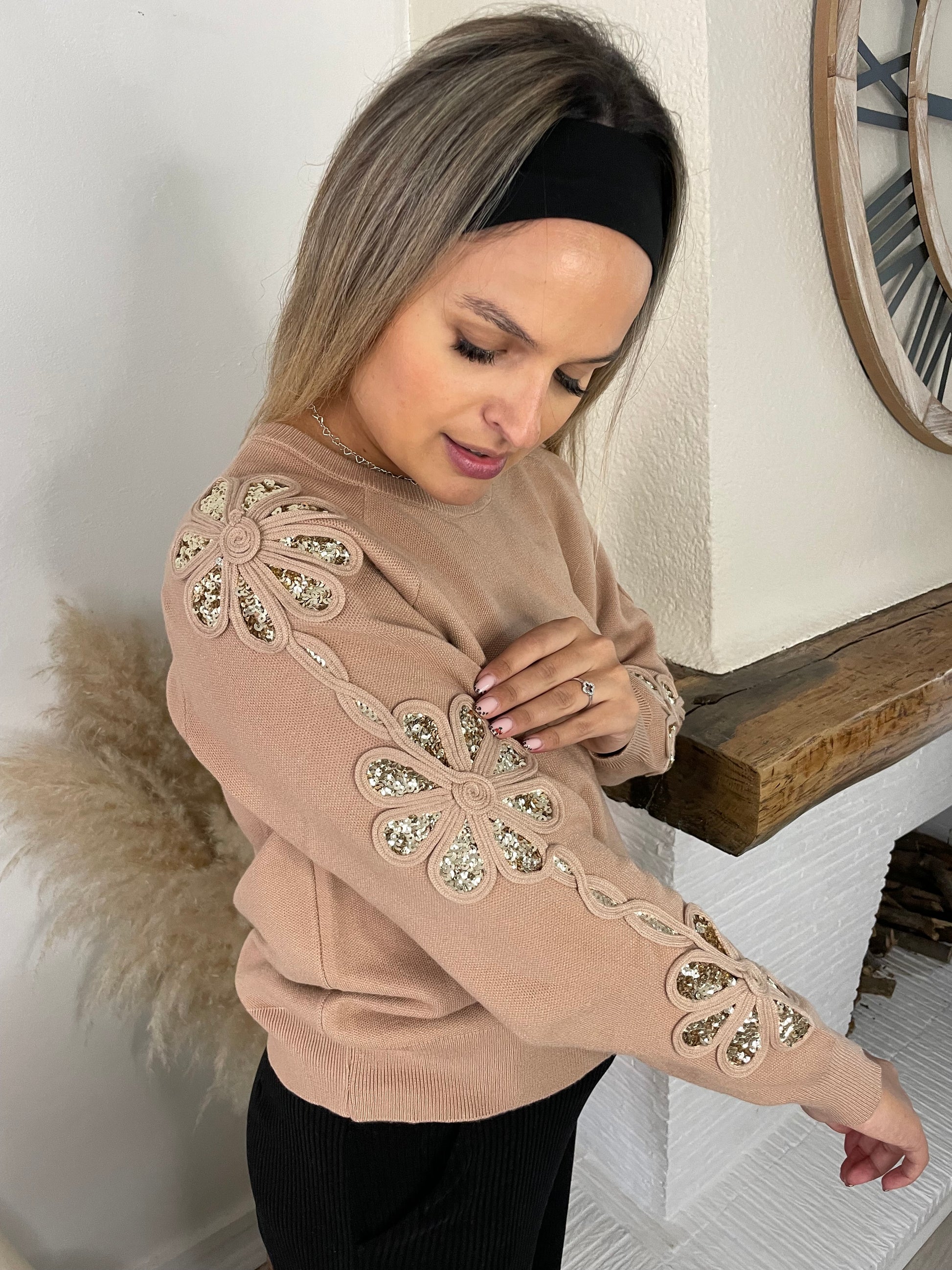 Joli pull blanc avec fantaisies aux manches. Les paillettes sont en sequin.